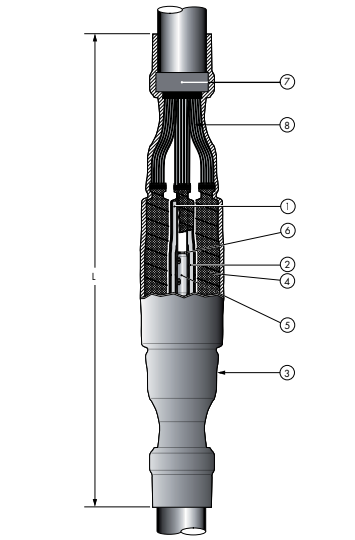 До 12 кВ Uo/U (Um) 6/10(12) кВ 6,35/11(12) кВТермоусаживаемая соединительная муфта для трехжильных кабелей с изоляцией из сшитого полиэтилена